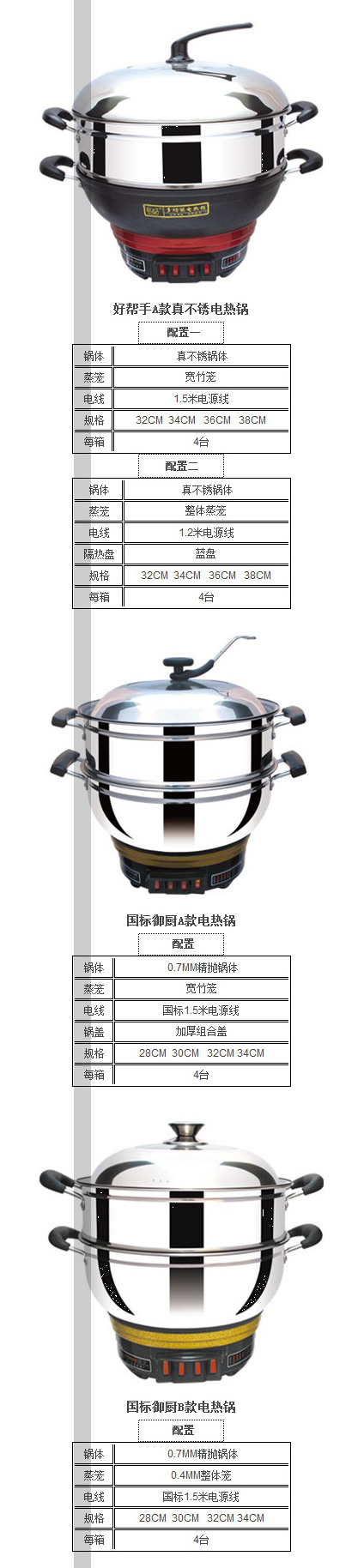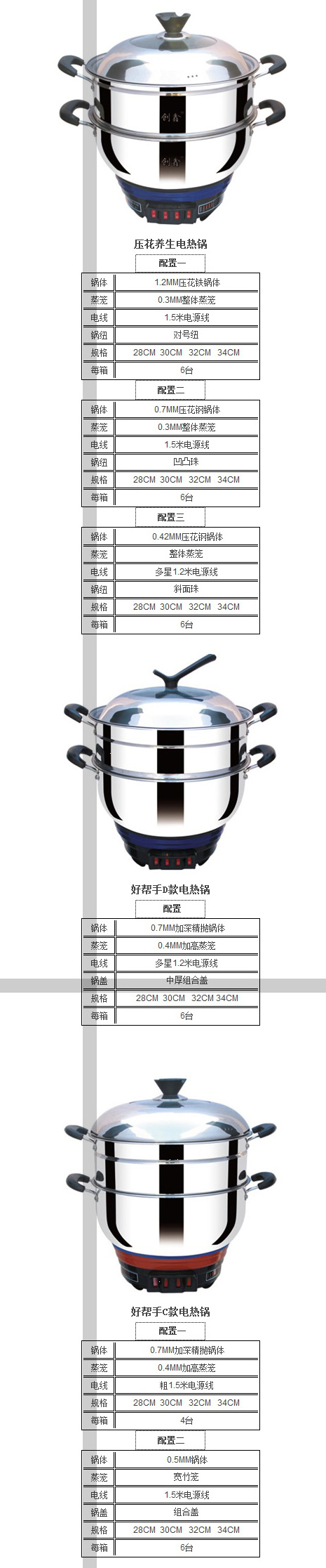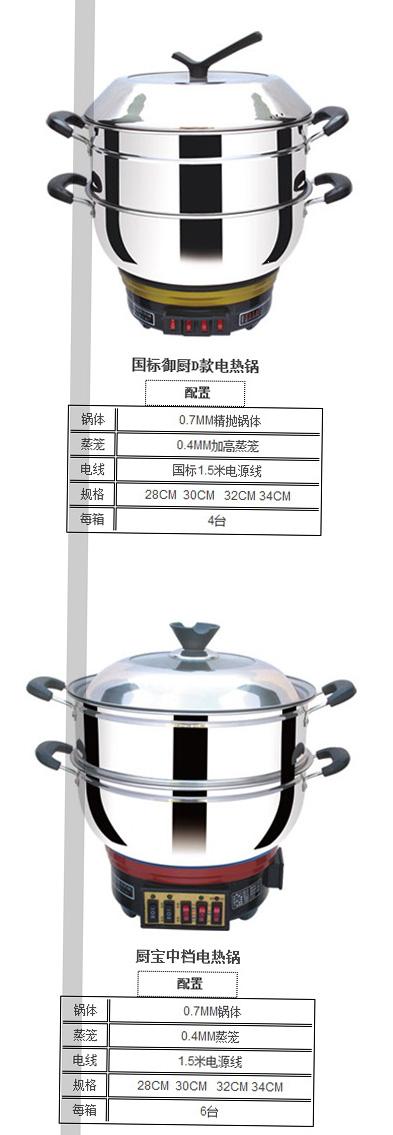 電熱鍋專業(yè)生產(chǎn)廠,永泰電器廠網(wǎng)站新增多款電熱鍋產(chǎn)品,新增有御廚A款、B款、御廚王,壓花養(yǎng)生電熱鍋,好幫手A款真不銹電熱鍋等多款產(chǎn)品。具體產(chǎn)品可在我廠產(chǎn)品中心瀏覽。